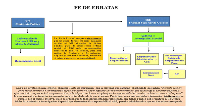 De Igual forma, el Pacto de Impunidad, con el ánimo de recalcar o evitar dudas alrededor de la intensión de la incorporación del artículo 131-A a la Ley Orgánica del Presupuesto, dispone que “durante esté en proceso la auditoria e investigación especial y hasta no haber agotado la vía administrativa y que ésta tenga el carácter de firme y ejecutoriada, no procederá ninguna acción judicial para reclamar ningún tipo de responsabilidad, sea ésta administrativa, civil o penal”. No obstante, con la Fe de Errata emitida por el Congreso Nacional, el Artículo 131ª solamente es modificado en sentido de eliminar precisamente dicho articulado que señala que “durante esté en proceso la auditoria e investigación especial y hasta no haber agotado la vía administrativa y que ésta tengo el carácter de firme y ejecutoriada, no procederá ninguna acción judicial para reclamar ningún tipo de responsabilidad, sea ésta administrativa, civil o penal”, dejando vigente lo relativo a que sigue siendo una Auditoria e Investigación Especial de los Fondos para los periodos indicados y que toda la documentación relacionada con dichos Fondos debe ser trasladada al Tribunal Superior de Cuentas (TSC) a efectos que en un plazo de tres (3) años exonere de responsabilidad o determine el tipo de responsabilidad existente. En consecuencia, la Fe de Erratas no es más que el mismo Pacto de Impunidad, pues de qué forma podría actuar el Ministerio Público, si existe una legislación especial (que está por encima de la legislación general) que señala que toda la documentación debe ser trasladada al Tribunal Superior de Cuentas (TSC) para realizar la Auditoría e Investigación Especial y determinar en un plazo de tres (3) años si existe responsabilidad civil, penal o administrativa.