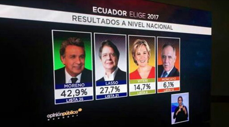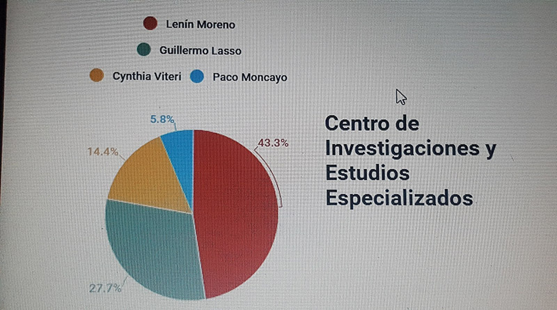 La compañía Opinión Pública señala que Moreno ha obtenido el 42,5%, mientras que Lasso ha logrado el 27,7% y Viteri el 14,7%.