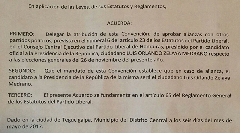 El acuerdo se rubricó durante la Convención Nacional “Jorge Bueso Arias”, celebrada en la capital hondureña. La resolución no sorprendió a nadie ya que es algo que desde ya días se había previsto, de acuerdo a las diferentes declaraciones vertidas por el aspirante liberal, quien en reiteradas ocasiones ha manifestado que su partido es quien debe llevar la delantera de la coalición opositora por es quien más votos obtuvo durante las elecciones primarias del 12 de marzo pasado. E incluso Luis Zelaya ha señalado que su partido tiene la suficiente membresía para derrotar por separado al presidente, Juan Hernández.