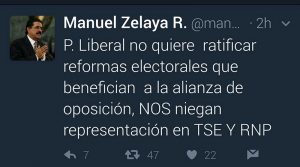 Zelaya agregó: “aquí hay un hecho, se le está negando un representante al partido de oposición más fuerte de la historia de Honduras y eso evidencia que hay un fraude montado, acuerdos montados para mantener el fraude”.