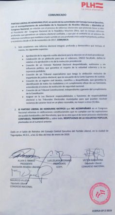 Este documento fue firmado por el presidente de los alcaldes liberales Allan Ramos, el presidente del Consejo Central Ejecutivo del Partido Liberal Luis Zelaya, el diputado Víctor Barahona y el diputado Mauricio Villeda.