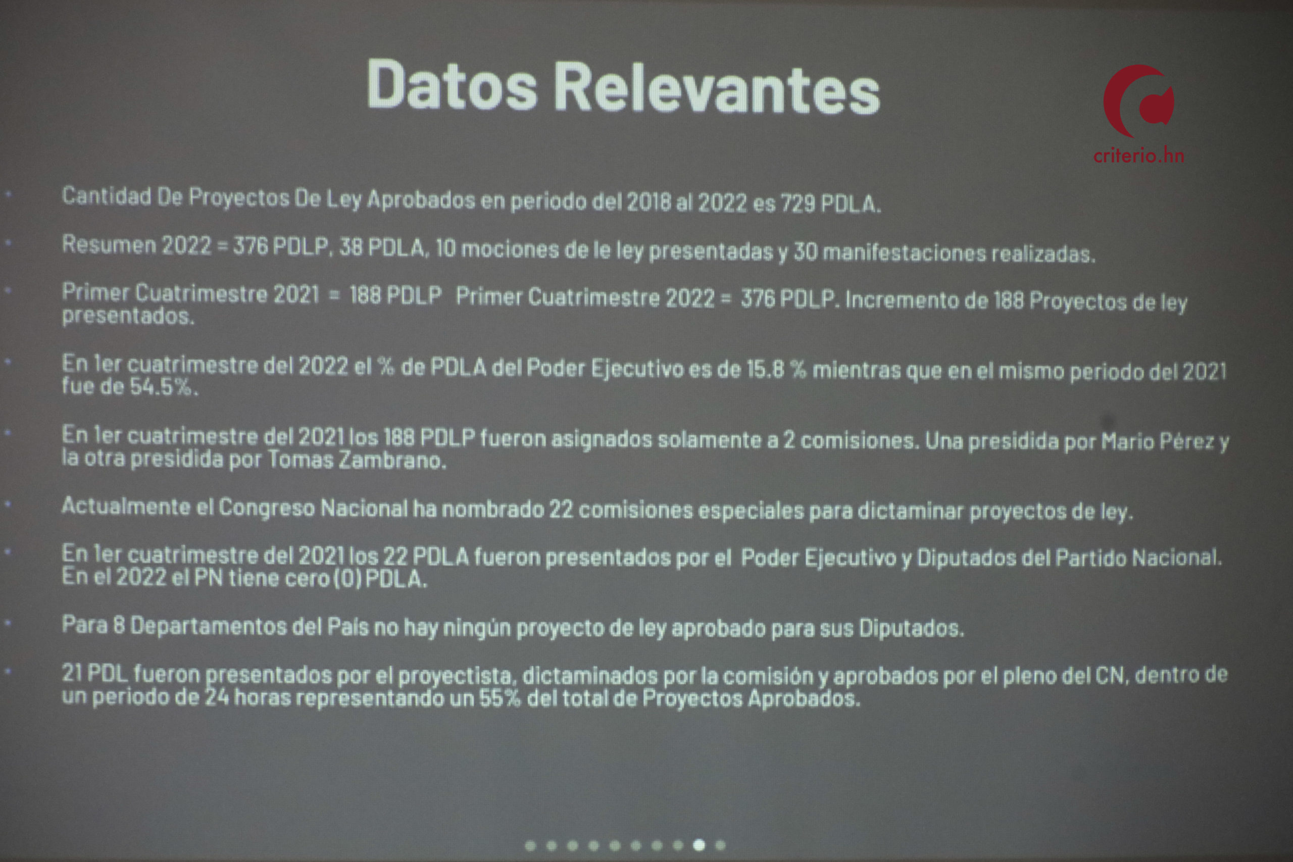 Cabe señalar que las cifras que se presentaron destacan el control que ejerce el partido político en el poder, para el caso, en el primer cuatrimestre de 2021, al mando del Partido Nacional, se aprobaron 22 proyectos de ley todos promovidos por dicho partido, en cambio, en 2022, al mando del Partido Libre en alianza con PSH, el Partido Nacional no tiene ningún proyecto aprobado.