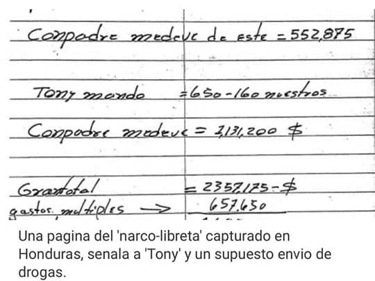 Dentro de la libreta, que contiene información contable sobre los trabajos de narcotráfico que realizaban los individuos, se encuentra el nombre de Juan Antonio Hernández, la narco libreta se encuentra en posesión de la fiscalía de Nueva York y forma parte de las pruebas que ellos utilizarán para demostrar la culpabilidad de Tony.