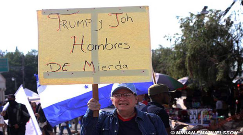 José Espinoza expresa su indignación contra el Sr. Trump en la manifestación junto con decenas de miles de hondureños que protestan en contra el supuesto fraude en las elecciones el 26 de noviembre de 2017 y la subordinación de la nación centroamericana a la política del Gigante del Norte. FOTO: MIRIAM EMANUELSSON.