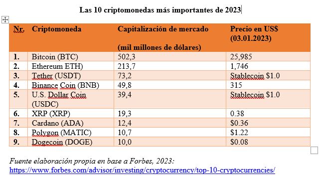 Actualmente podemos decir que Bitcoin es la primera moneda digital descentralizada del mundo y que cuenta actualmente con la más alta capitalización en el mercado de criptomonedas (ver tabla más abajo). Desde que Satoshi creó en 2009 el Bitcoin, ha surgido todo un complejo ecosistema de criptomonedas en rápida evolución y expansión. En la actualidad existen, según las expertas y los expertos, más de 22.000 criptodivisas, frente a las 1.500 de 2018. Lo que empezó como un ejercicio informático en la era de la digitalización, se ha convertido en un modelo de negocios financieros que atrae no solo a los curiosos, sino también a magnates como Elon Musk o “presidentes millenials” como Nayib Bukele. Sin embargo dichas criptomonedas se caracterizan por tener precios muy volátiles y carecer de respaldo físico. Debido a esto han surgido otras criptomonedas que son convertibles a pedido y a un precio fijo en algo que supuestamente es más estable, las autodenominadas «monedas estables» («Stablecoins»).