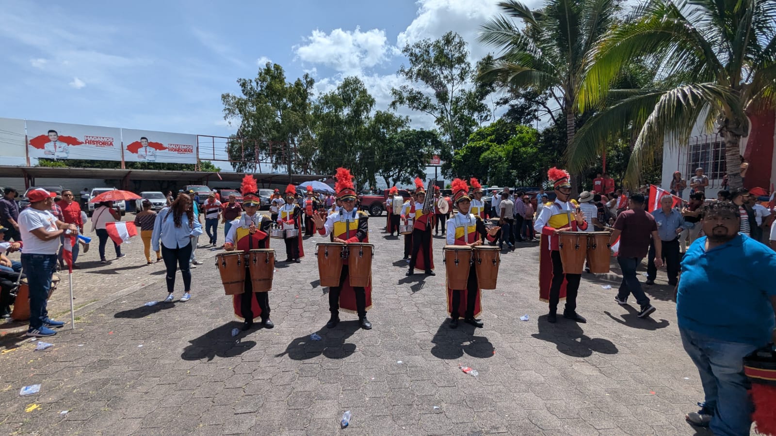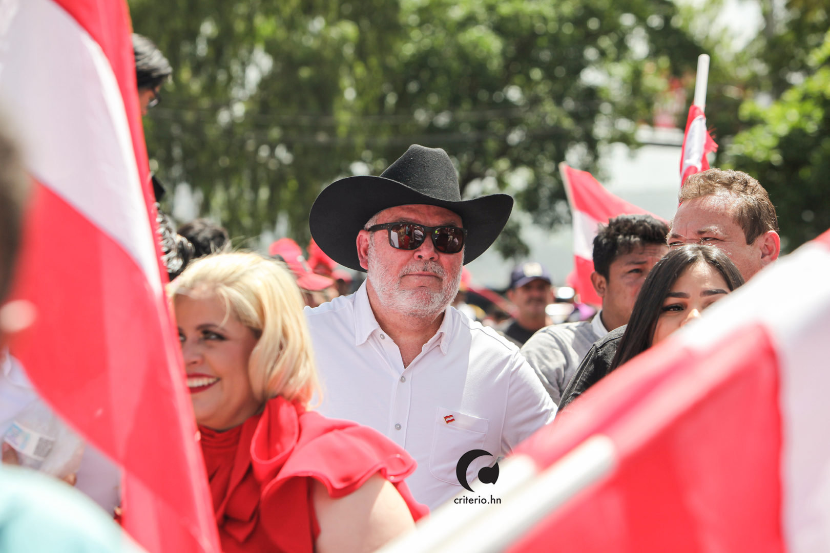 Entre gritos, aplausos, pitos y el acompañamiento de una banda marcial, Nasralla, ahora precandidato, apareció vestido de blanco y con una corbata de rayas rojas y blancas, saludando y abrazando a los simpatizantes que coreaban su nombre como muestra de apoyo a su postulación.