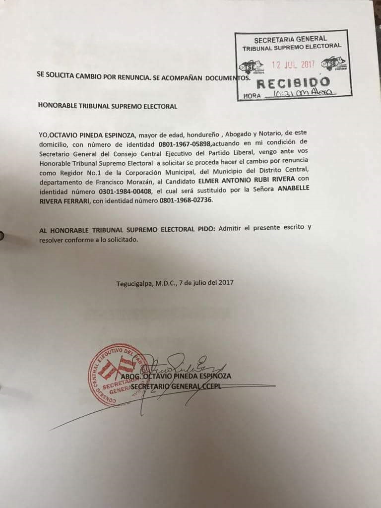 Octavio Pineda Espinoza, secretario del Consejo Central Ejecutivo del Partido Liberal (CCEPL) ya presentó la solicitud de cambio al Tribunal Supremo Electoral.
