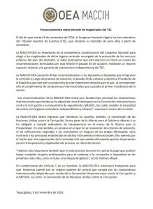 La MACCIH-OEA desea expresar que Honduras ha suscrito, además, Ia Convención de las Naciones Unidas contra la Corrupción, forma parte de Ia Alianza para el Gobierno Abierto y se ha obligado a cumplir estándares de transparencia en el marco de la Alianza para Ia Prosperidad. En este sentido, un proceso en el que no se conocieron los criterios de selección, ni las calificaciones asignadas a los postulantes en ninguna de las etapas efectuadas, sería contrario a los principios establecidos en dichos instrumentos internacionales. Ello además por el hecho que una organización de la sociedad civil que estaba efectuando aportes importantes para la transparencia y objetividad del proceso, se retire del mismo