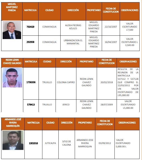Los bienes que fueron requeridos ante el juzgado de Privación de Dominio para que pasen a nombre del Estado de Honduras, así como sus titulares son los siguientes:
