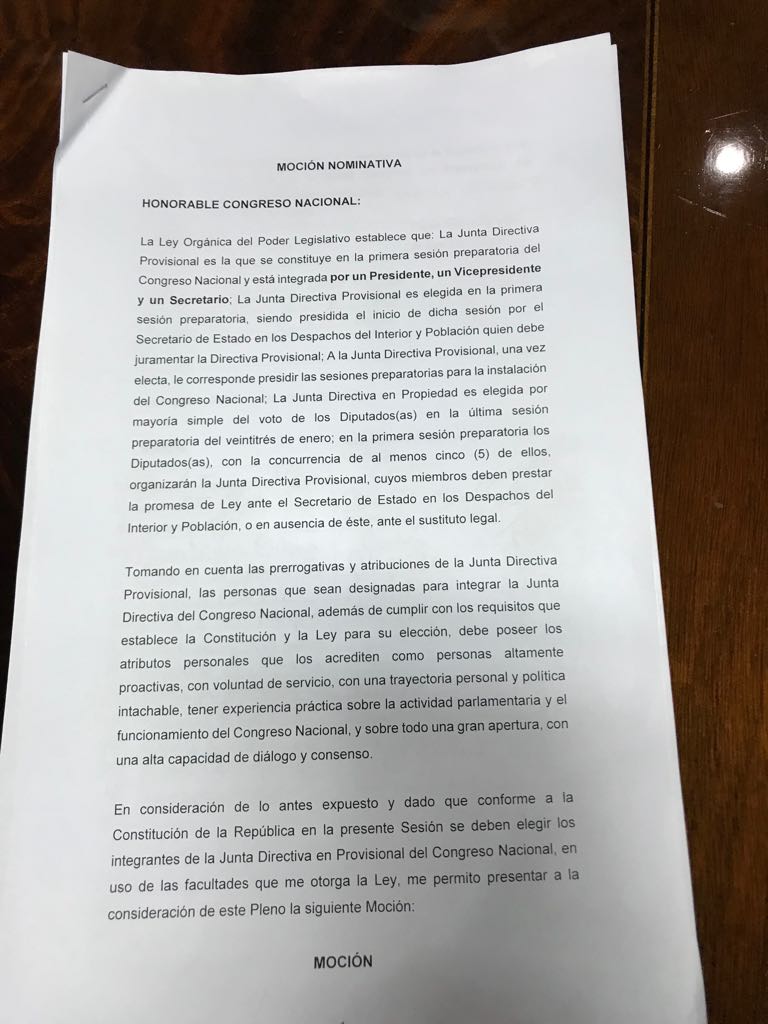 Esta es la moción presentada por el Partido Nacional para integrar la Junta Directiva Provisional del Congreso: