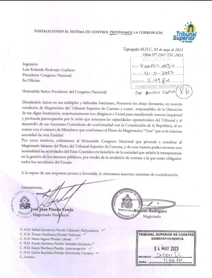 La solicitud se formalizó mediante la remisión del Oficio No. 2567-TSC-2023, dirigido al presidente del Poder Legislativo, Luis Redondo y a los jefes de bancada. El documento fue suscrito por los magistrados del TSC, José Juan Pineda Varela y Ricardo Rodríguez.