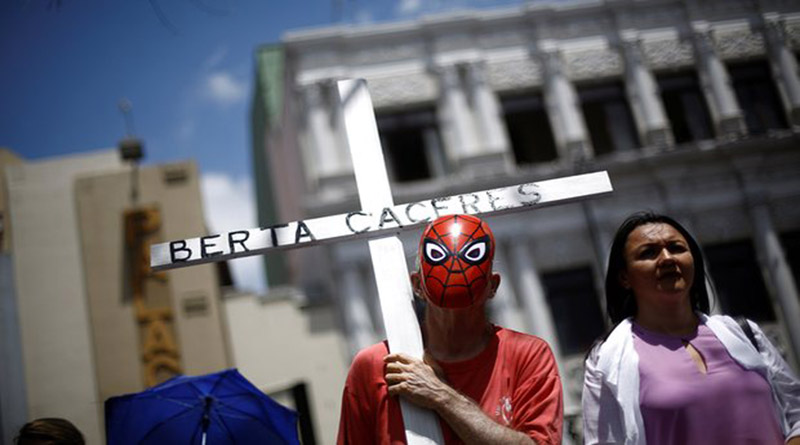 El presidente Juan Hernández, viajó a Washington para reunirse con los legisladores el martes y fue recibido por manifestantes portadores de carteles con fotografías de activistas asesinados y cantos de asesino. Cáceres fue uno de los más de 120 activistas de tierra y medio ambiente asesinados desde que un golpe de estado respaldado por el ejército derrocó al presidente Manuel Zelaya, electo democráticamente en 2009, según la ONG anti-corrupción Global Witness.