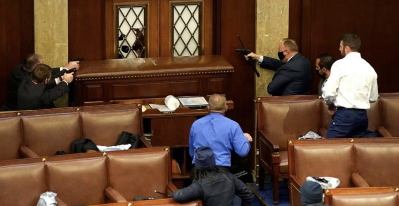Según los informes, se escuchó a los manifestantes que lograron entrar al edificio del Capitolio golpeando las puertas del piso de la Cámara.