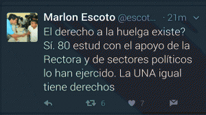 Escoto tiene una fijación contra la rectora Julieta Castellanos a quien acusa de ser la promotoras de la huelga en Catacamas: “El derecho a la huelga existe? Si. 80 estudiantes con el apoyo de la rectora y de sectores políticos lo han ejercido. La UNA igual tiene derechos.