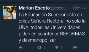 En otro tuit admite que la educación superior está en crisis y que hay que reformar todo el sistema y las universidades que lo integran al manifestar: “La educación Superior está en crisis señora rectora, no solo la UNA, todas las universidades piden en su interior REFORMAS y desmonopolizar.