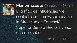 Escoto la ha emprendido directamente contra la rectora de la Universidad Nacional Autónoma de Honduras (UNAH) y en otro Tuit escribió: “El tráfico de influencias y el conflicto de intereses campea en la Dirección de Educación Superior señora rectora y eso usted lo sabe”.