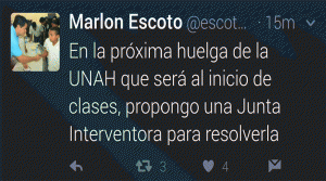 Advierte que habrá una nueva huelga en la UNAH y pide que se conforme una junta interventora para resolver el problema de la máxima casa de estudios. Así dice otro de sus tuits: “ En la próxima huelga de la UNAH que será al inicio de clases propongo una junta interventora para resolverla”.