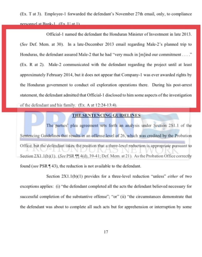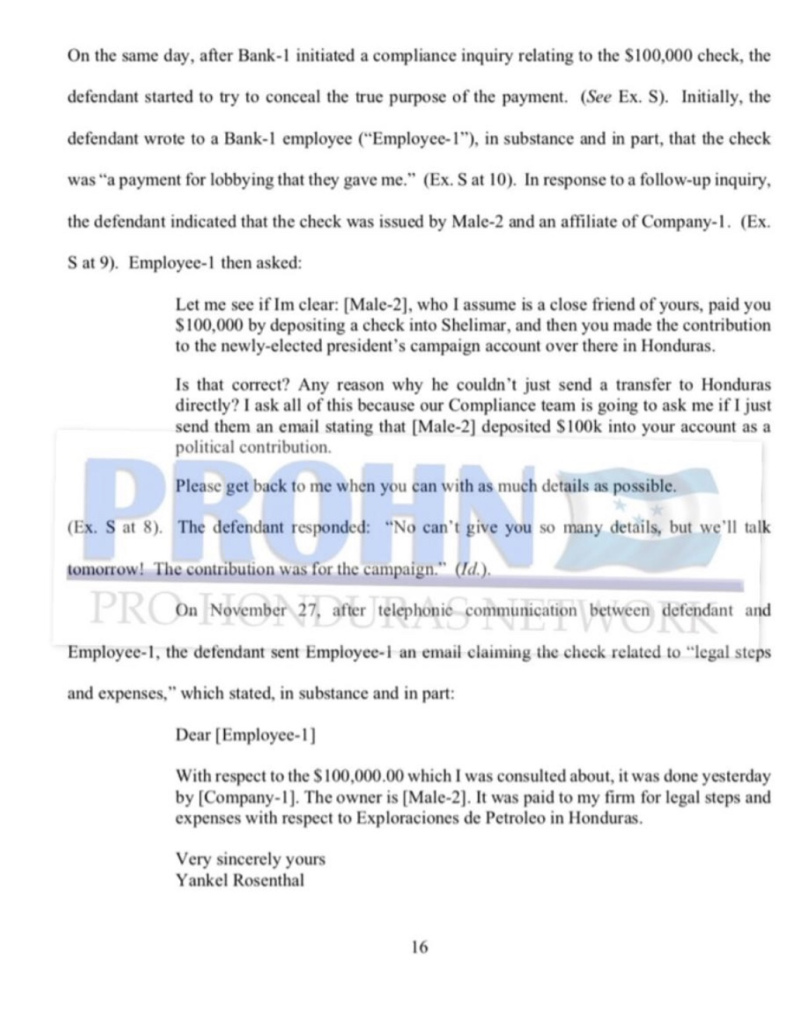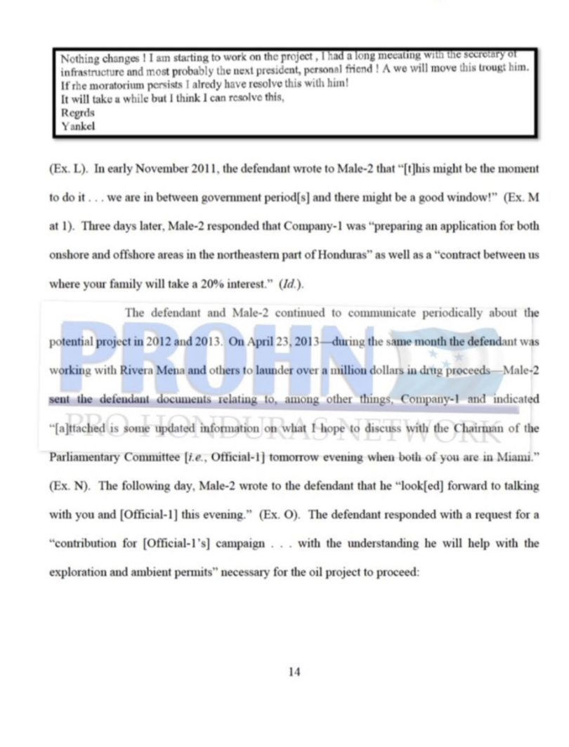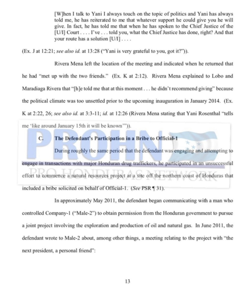 Tegucigalpa.-Según documentos de la Corte del Distrito Sur de New York, relacionados con el caso de Yankel Rosenthal Coello, en el año 2013 el gobernante de Honduras, Juan Hernández recibió $100,000 dólares (2,560,000 lempiras) a cambio de aprobar permisos para la exploración de petróleo a una empresa estadounidense. Los hechos se detallan a continuación: