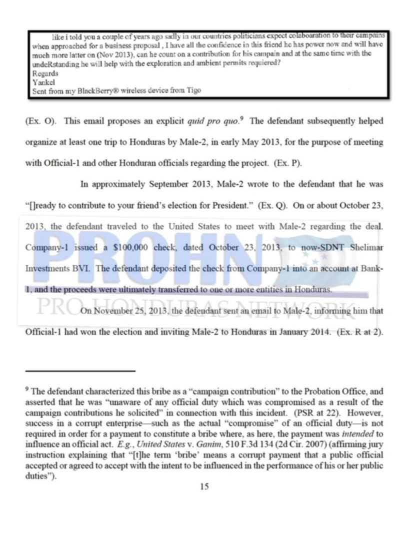 El 23 octubre de 2013 Yankel viajó a Estados Unidos para cerrar el trato con la empresa Shelimar Investments, estos le giraron un cheque por un monto $100,000 USD (2,500,000 lps) que servirían como contribución a la campaña de Juan Orlando Hernández, un mes después Yankel se comunicó con el empresario para notificarle que Juan Orlando había ganado las elecciones e invitándolo a la toma de posesión.