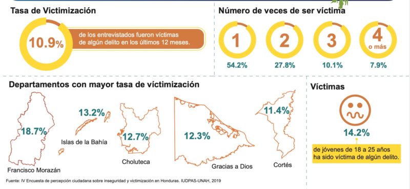 Los datos del informe, provenientes de la IV Encuesta de percepción ciudadana sobre inseguridad y victimización Honduras 2019, realizada con apoyo del NDI, añaden que el departamento con mayor cantidad de victimización es Francisco Morazán con 18.7% de los entrevistados para el estudio, seguido por Islas de la Bahía con 13.2% y Choluteca con 12.7%.