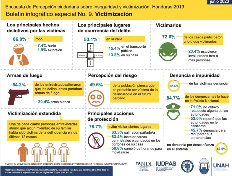 Tegucigalpa, Honduras.- El 54% de los hondureños han sido víctimas de algún delito mientras al 11% le ha sucedido lo mismo durante el último año, según el informe sobre victimización lanzado en junio de 2020 por el Instituto Universitario en Democracia, Paz y Seguridad (IUDPAS) de la Universidad Nacional Autónoma de Honduras en sociedad con el estadounidense Instituto Nacional Demócrata para los Asuntos Internacionales (NDI por su sigla en inglés).
