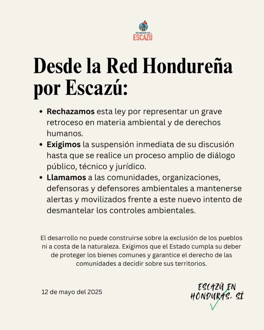 Mediante publicaciones en X, la Red Hondureña por Escazú dio a conocer el rechazo de la iniciativa al considerarla un grave retroceso en materia ambiental y de derechos humanos, y a su vez, exigió a las autoridades del Congreso Nacional que suspendiera de manera inmediata la discusión hasta que se realizará una mesa de diálogo público, técnico y jurídico. Sin embargo, las exigencias en torno a la ley han sido ignoradas.