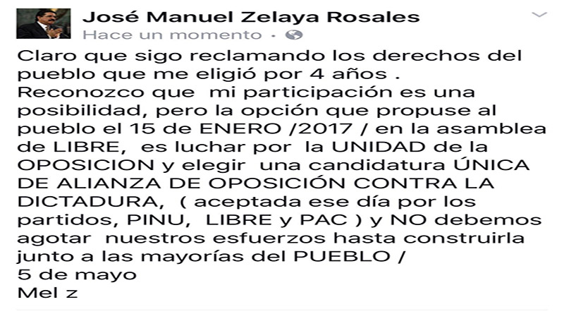 Zelaya Rosales expuso lo anterior en una publicación que hizo en las redes sociales en la que textualmente expresa: “Claro que sigo reclamando los derechos del pueblo que me eligió por cuatro años. Reconozco que mi participación es una posibilidad, pero la opción que propuse al pueblo el 15 de enero de 2017, en la asamblea de Libre, es luchar por la unidad de la oposición y elegir una candidatura única de la Alianza de Oposición contra la dictadura”.