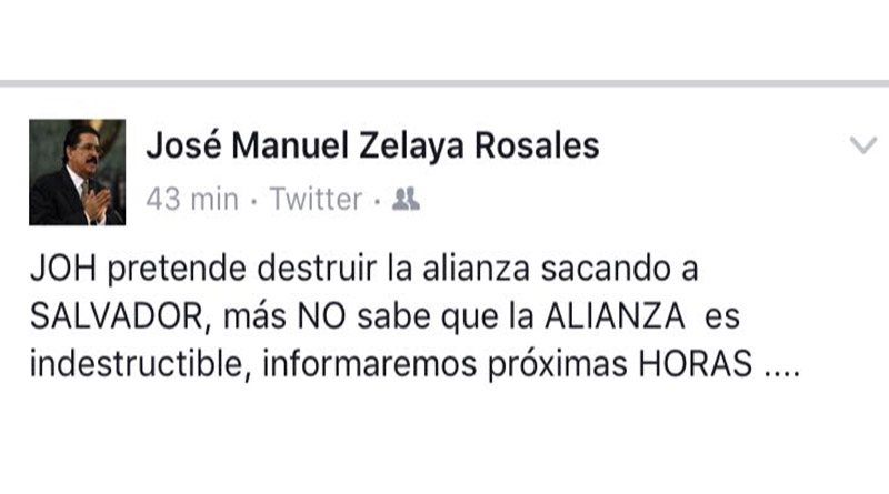 Tegucigalpa.- El futuro de la alianza opositora cada día es más incierto de acuerdo a lo que está ocurriendo en Honduras en materia política, sin embargo el expresidente, Manuel Zelaya Rosales, escribió este martes en su página de Twitter: “Joh pretende destruir la alianza sacando a Salvador, mas no sabe que la alianza es indestructible, informaremos en las próximas horas”.
