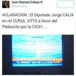 Posteriormente, a las 9:41 de la noche, siempre por el Twitter, aclaró que el diputado Jorge Cálix votó desde su curul a favor del plebiscito para la CICIH. Cálix, quien es el diputado suplente de la diputada Beatriz Valle, publicó en su cuenta de Facebook, que en efecto votó en la butaca de Zelaya.