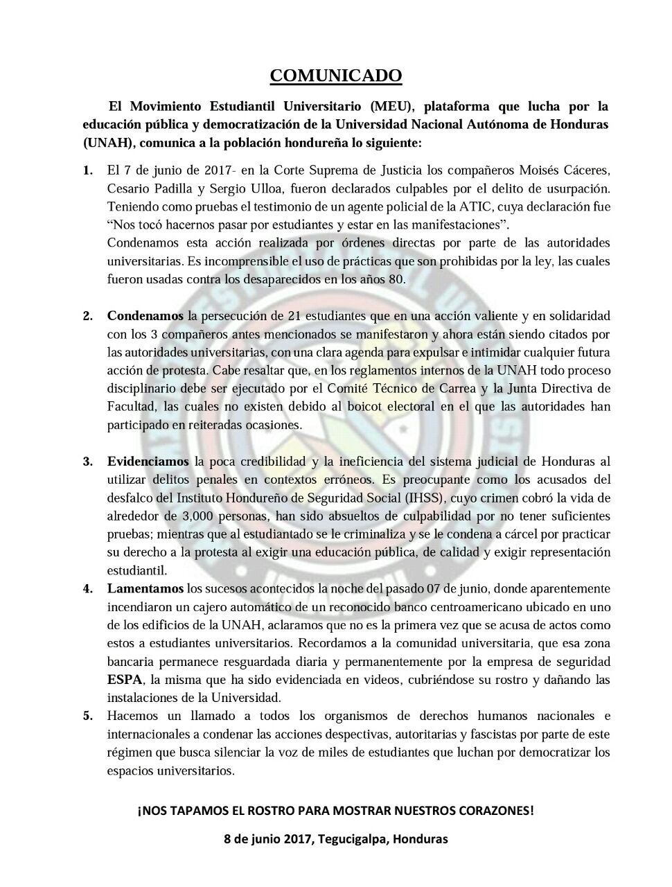 Tegucigalpa.- El Movimiento Estudiantil Universitario (MEU) repudia la condena de sus tres compañeros de lucha Cesario Padilla, Moisés Cáceres y Sergio Ulloa quienes fueron encontrados culpables del delitos de usurpación con el testimonio de una agente infiltrada de la Agencia Técnica de Investigación (ATIC).
