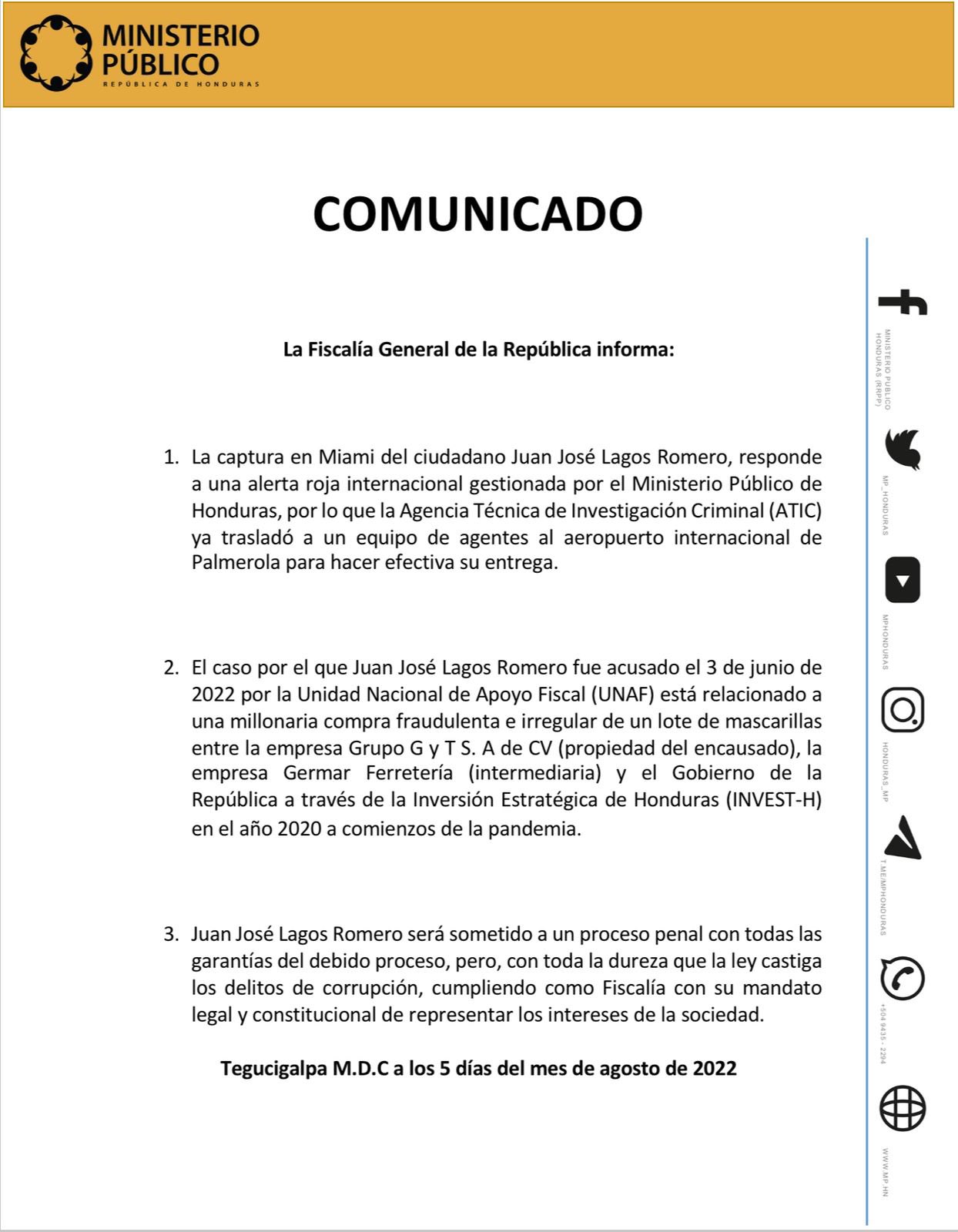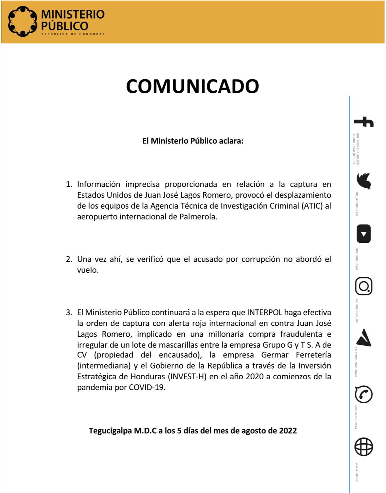“El Ministerio Público continuará a la espera que Interpol haga efectiva la orden de captura con alerta roja internacional en contra Juan José Lagos Romero, implicado en una millonaria compra fraudulenta e irregular de un lote de mascarillas entre la empresa Grupo G y T S. A de CV, propiedad del encausado, la empresa Germar Ferretería, intermediaria, y el gobierno de la república a través de la Inversión Estratégica de Honduras (Invest-H) en el año 2020 a comienzos de la pandemia por Covid-19”, expone el nuevo comunicado.