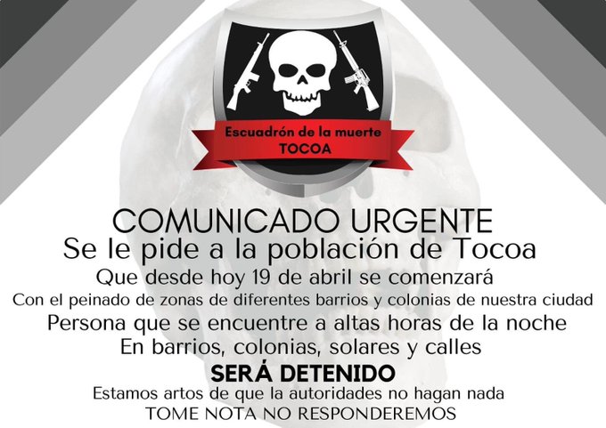 Recientemente, trascendió en medios locales que, debido al incremento de la violencia y la falta de respuesta por parte de las autoridades encargadas de la seguridad, se conformó un “escuadrón de la muerte” en Tocoa que advierte a la población evitar transitar barrios y colonias en altas horas de la noche de lo contrario su vida correrá riesgo.