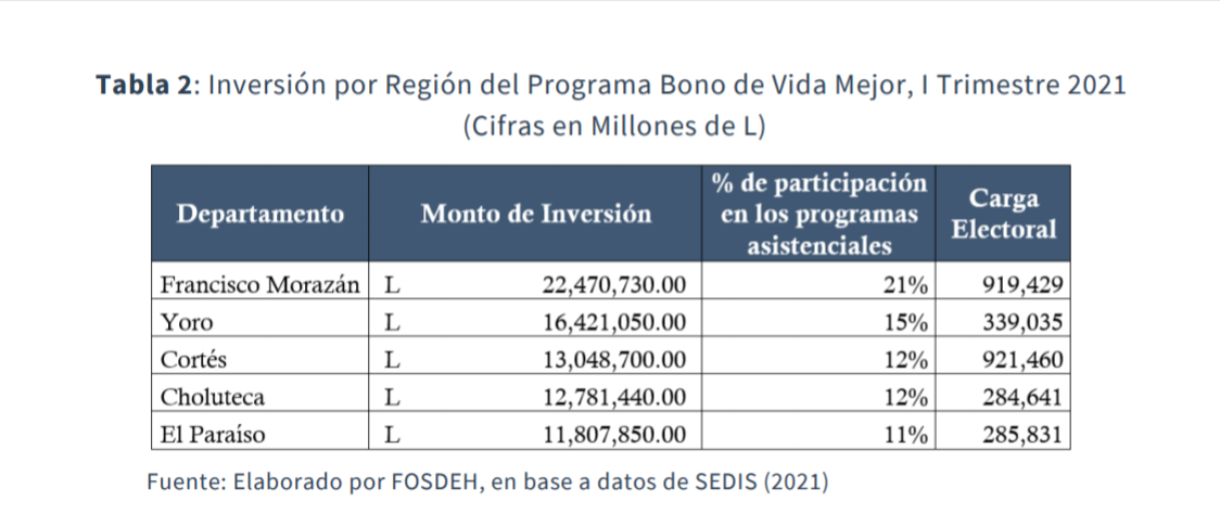 Un ejemplo de este accionar, apunta la organización de sociedad civil es el programa Bono Vida Mejor, el cual para el primer trimestre de 2021 mostró cifras que alcanzaban un monto de L. 22,470.73 millones de inversión en Francisco Morazán; sin embargo, departamentos como Gracias a Dios y Ocotepeque con limitado desarrollo económico se ven excluidos de estas iniciativas.