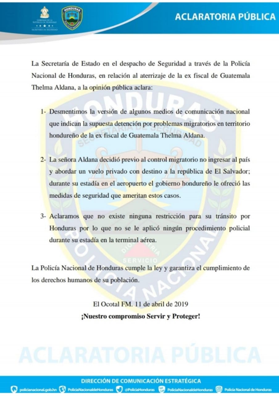 La Secretaría de Seguridad de Honduras emitió un comunicado donde desmiente la detención de Thelma Aldana y asegura que la exfiscal de Guatemala decidió no entrar al país y regresar a El Salvador.