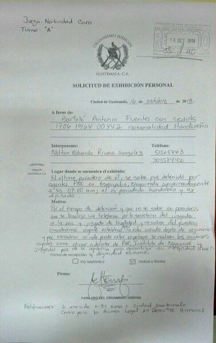 El recurso fue interpuesto por Eduardo Rivera González y señala que Fuentes, con cédula de identidad número 1706-1964-00442, fue detenido por elementos de la Policía Nacional Civil (PNC) de Guatemala en la ciudad de Esquipulas a las 7:00 de la mañana.