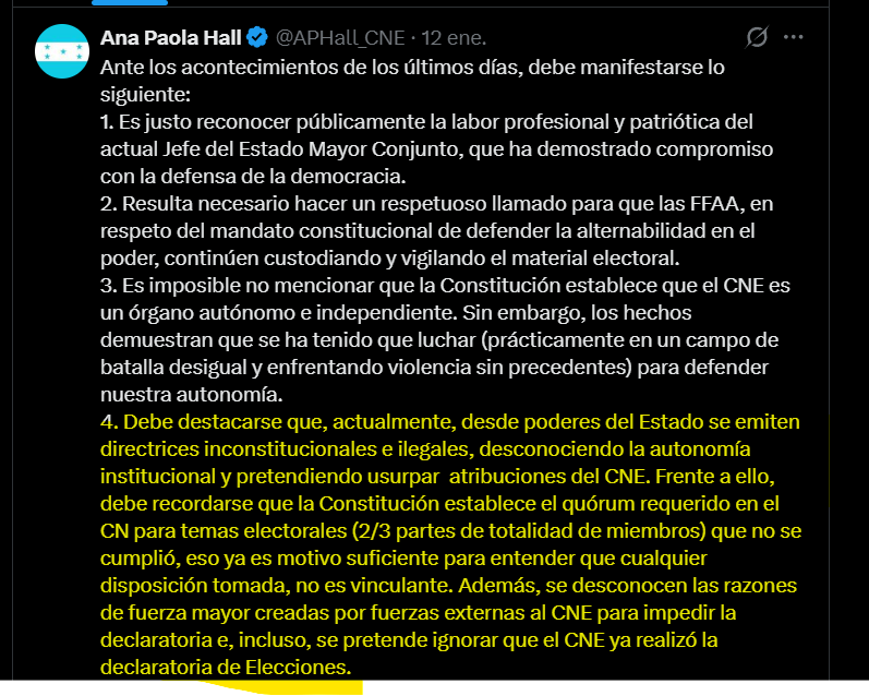 La consejera presidenta del CNE, Ana Paola Hall, luego de la aprobación y publicación en el diario oficial la gaceta del Decreto 58-2025, que ordena el conteo total de los votos, posteó, en su cuenta de X, un extenso mensaje a fin de justificar la cuestionada declaratoria.