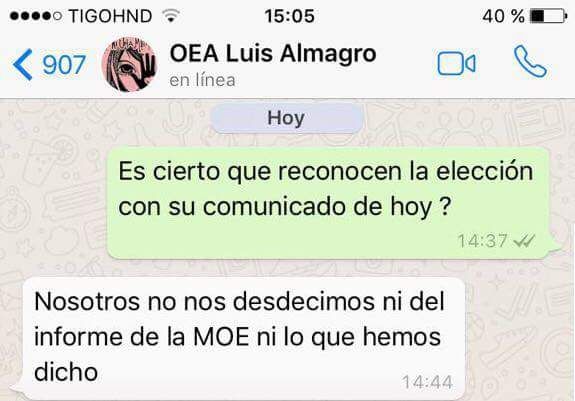 Nasralla explicó que luego de conocer el comunicado mediante el cual la OEA anunció este lunes que está dispuesto a trabajar a futuro con las autoridades electas en Honduras en los tres niveles electorales, presidencial, diputados y municipal, le escribió un Whatsaap a Almagro.