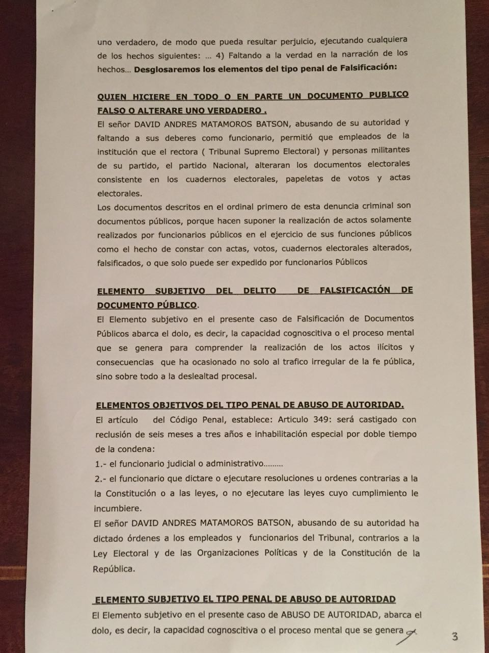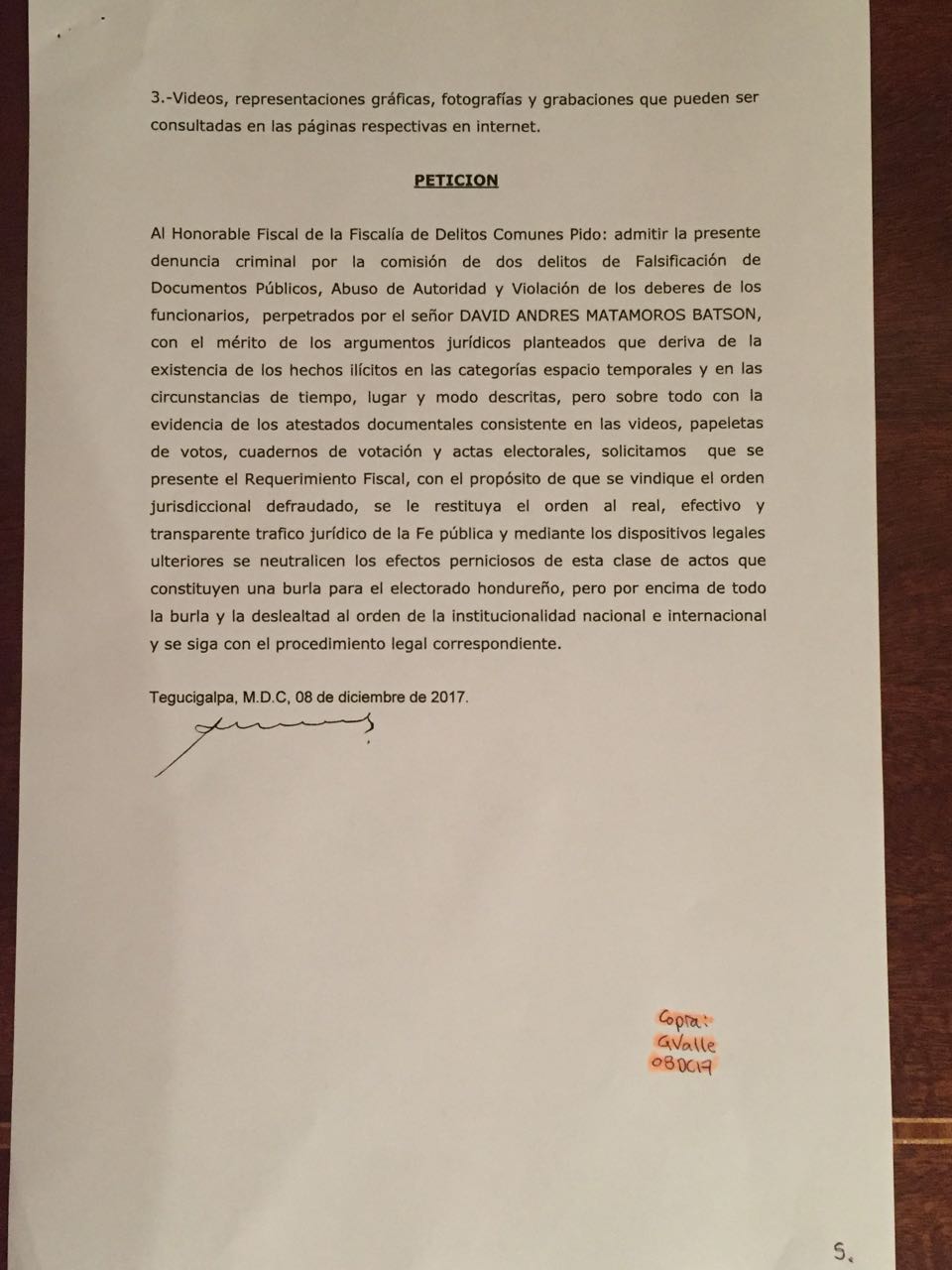 Nasralla presentó un documento mediante el cual pide se abra investigación contra Matamoros Batson por los delitos de abuso de autoridad, violación de los deberes de los funcionarios y falsificación de documentos.
