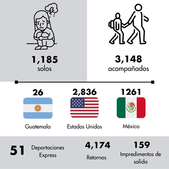 Según las cifras recabadas de Coiproden, en detalle revelan que, del total de menores de edad deportados hasta la fecha, el 43% son niñas y el 57% niños, de estos, 1,185 viajaron solos y 3,148 viajaron acompañados.