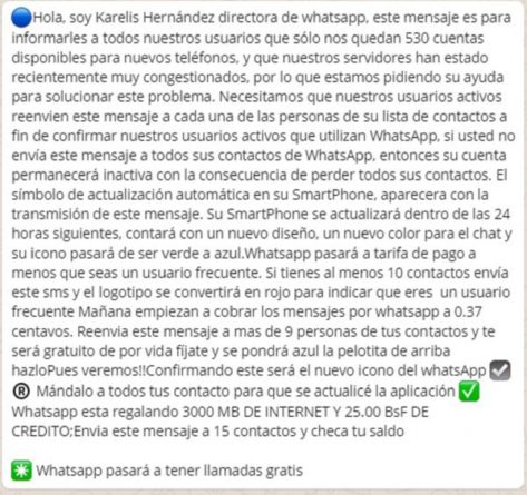 El mensaje comienza con la presentación de «Karelis Hernández» quien sería la «directora de whatsapp» e informa que sólo quedan «530 cuentas» para nuevos teléfonos y por eso se congestionaron los servidores causando un apagón.