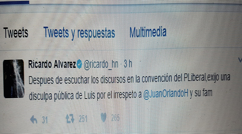 La respuesta se la dio Ortez a Ricardo Álvarez en relación a un tuit que ha publicado el designado presidencial donde dice que el presidenciable liberal Luis Orlando Zelaya, debe pedir perdón porque ofendió al presidente Juan Hernández y a su familia.