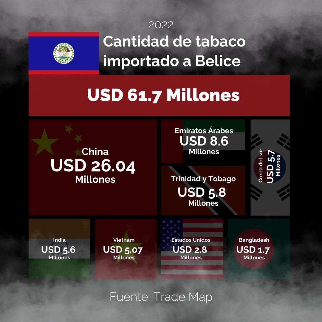 Otra dato revelador y que sugiere la ruta de ingreso de los cigarrillos asiáticos a Centroamérica, es que, Belice, con una población de 410 mil habitantes, importó en 2022 USD 65.3 millones en cigarrillos, siendo el quinto producto que más se importó en ese año. Esto equivale a que cada ciudadano, incluídos bebés, gastarían USD 160 anuales en este producto.