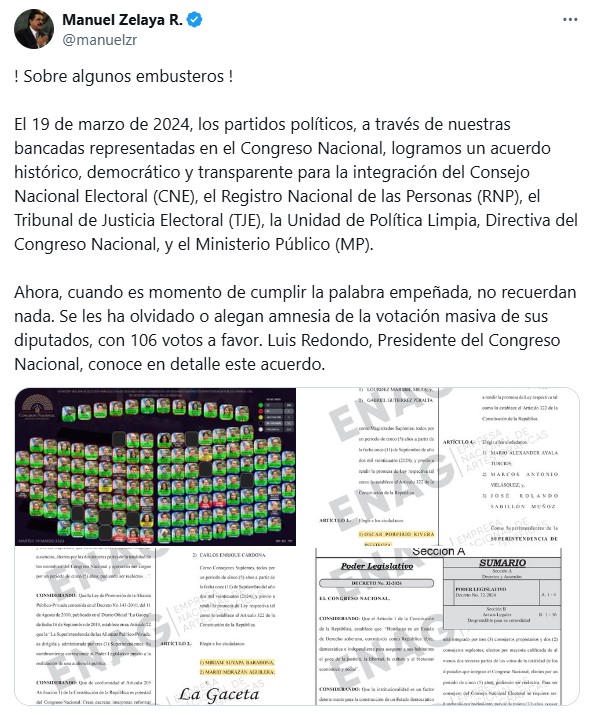 Zelaya recordó que dicho acuerdo, respaldado por 106 votos en el Congreso Nacional, fue calificado como histórico, democrático y transparente, también mencionó que Luis Redondo, presidente del Congreso Nacional, está al tanto de los detalles de este pacto, pero ahora algunos actores políticos parecen sufrir de «amnesia» respecto a su cumplimiento.