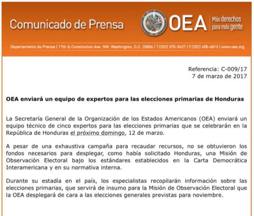 El comunicado no detalla las razones del por qué no se obtuvo el financiamiento que permitiera el envío de la misión que la OEA había prometido y para el cual había firmado un convenio con el gobierno de Honduras el pasado 3 de febrero.