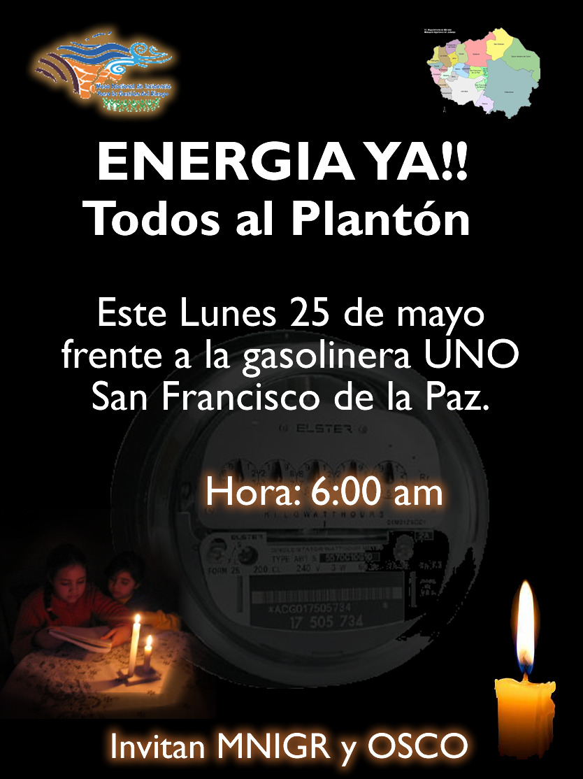 La acción que está siendo convocada por las redes sociales por la Organización de Sociedad Civil de Olancho (OSCO) y la Mesa Nacional de Incidencia para la Gestión de Riesgo región Olancho (MNIGR/O) y está programada para las 6:30 de la mañana frente a la subestación de la ENEE en la comunidad de La Morita en la entrada a la ciudad.