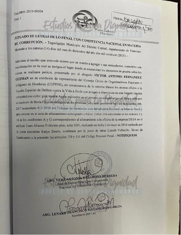 La acción peticionaria, enmarcada en el caso «Fraude Sobre el Gualcarque», fue realizado por el abogado Víctor Fernández del bufete Estudios Para la Dignidad, en representación del Consejo Cívico de Organizaciones Populares e Indígenas de Honduras (Copinh). No se descarta que los hallazgos en dichas computadoras puedan impactar en otras líneas de investigación, entre ellas la investigación del asesinato de Berta Cáceres.
