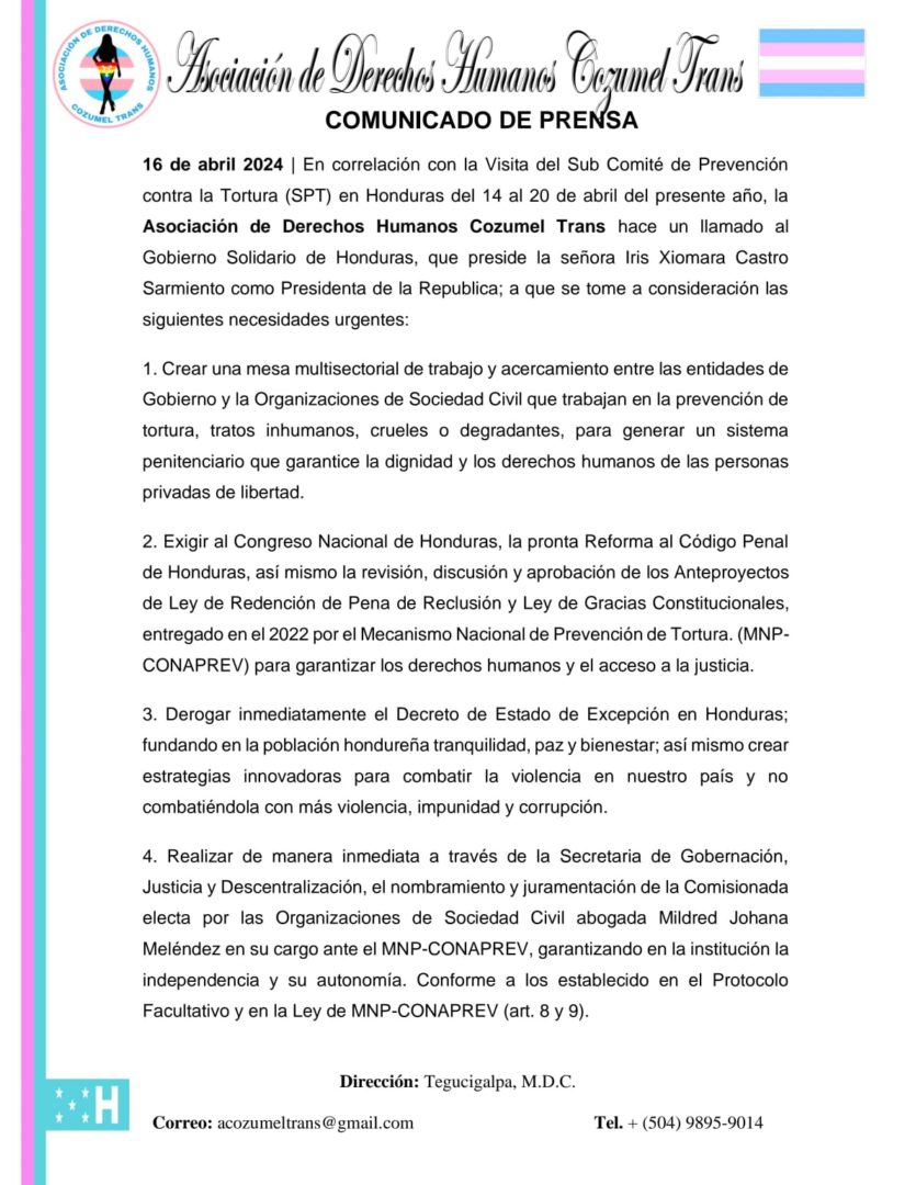 Tegucigalpa, Honduras. – La Asociación de Derechos Humanos Cozumel Trans solicitó al gobierno de Honduras la aplicación de una serie de medidas para proteger los derechos humanos de las personas privadas de libertad.