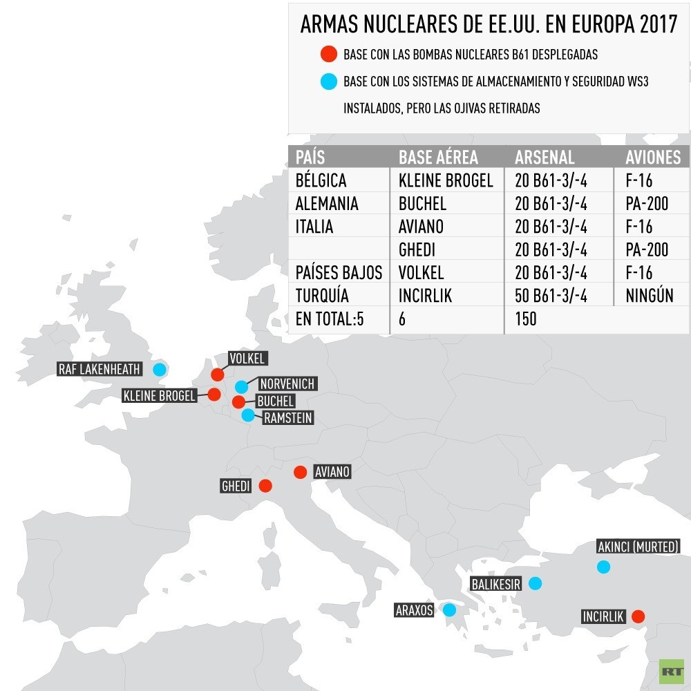 «EE.UU. despliega alrededor de 150 armas nucleares en Europa, en particular las bombas de caída libre B61, que pueden ser desplegadas tanto por aviones estadounidenses como aliados. Estas bombas se almacenan en seis bases estadounidenses y europeas: Kleine Brogel en Bélgica, Büchel en Alemania, Aviano y Ghedi-Torre en Italia, Volkel en los Países Bajos e Incirlik en Turquía», cita el medio belga.