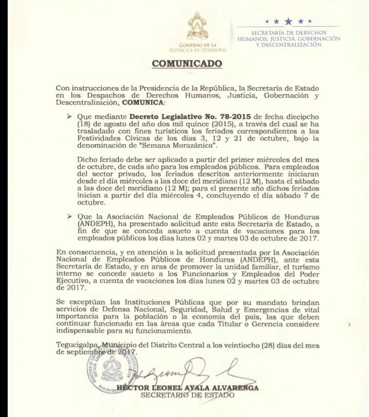 En un comunicado de la Secretaría de Gobernación, justicia y Descentralización se establece el feriado denominado «Morazánico» que corresponde a los feriados del 3, 12 y 21 de octubre que están contemplados en el decreto 78-2015 y a petición de la Asociación Nacional de Empleados Públicos de Honduras (ANDEPH), se les ha otorgado los días 2 y 3 para completar la semana.