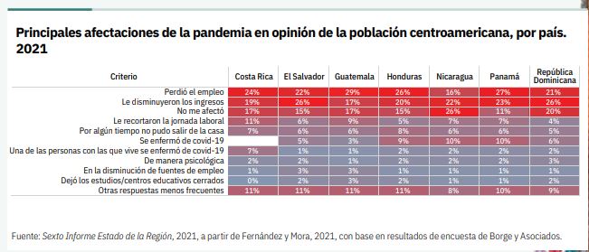 “Para mitigar los impactos sociales de la pandemia, los gobiernos tomaron medidas que no en todos los países beneficiaron a las personas que más las necesitaron. La encuesta realizada a inicios de este año para este Informe detectó que mientras en El Salvador 9 de cada 10 personas manifiestan haber sido beneficiarias de esas medidas, 8 de cada 10 nicaragüenses y 7 de cada 10 hondureños aseguran no haber recibido ningún servicio o apoyo del gobierno.